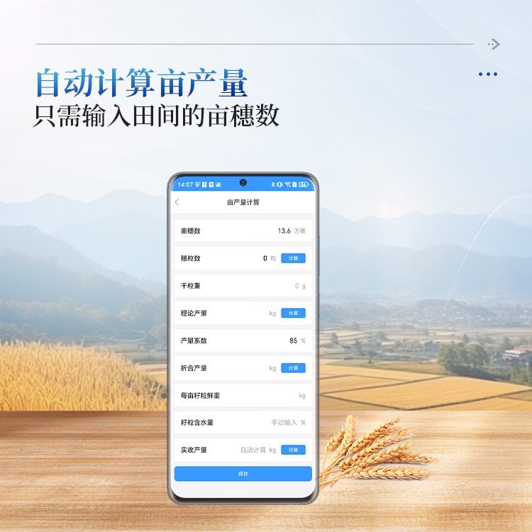 高灵活性:可以将亩穗数、穗粒数先保存数据,后期获取到千粒重后进行亩产量计算。可以灵活调整产量系数和麦粒含水量用来计算折合产量和实收产量。
